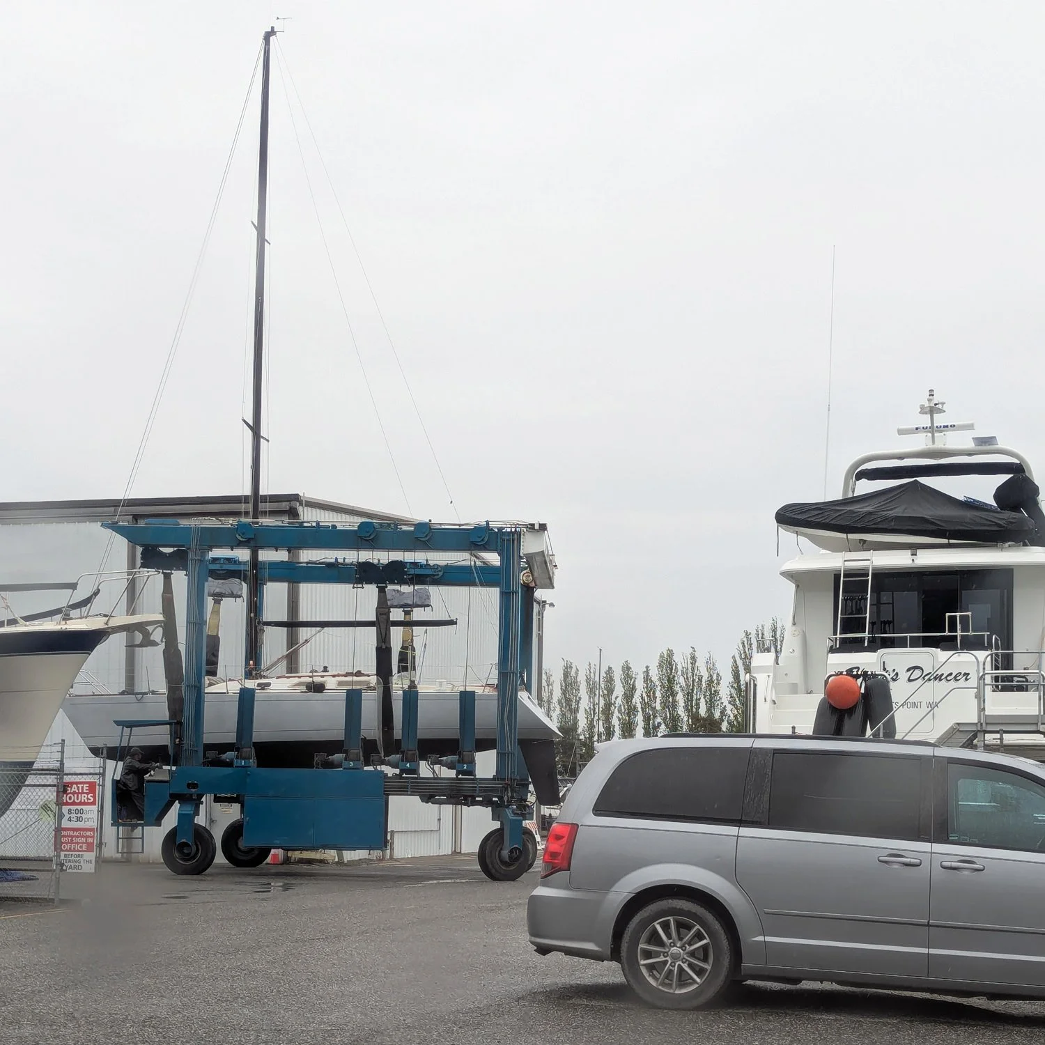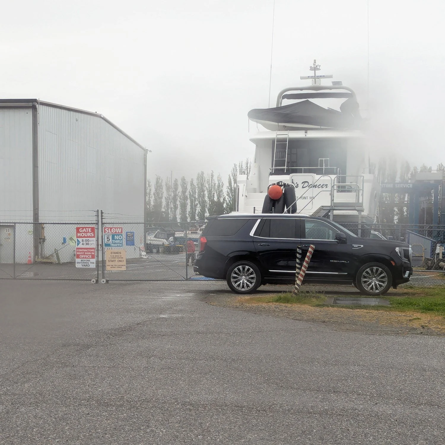 At the end of a long rainy day, the yard splashed my partner’s boat into the water. Once they all saw it remain afloat for a minute or two, they called it good and locked the gates for the night.