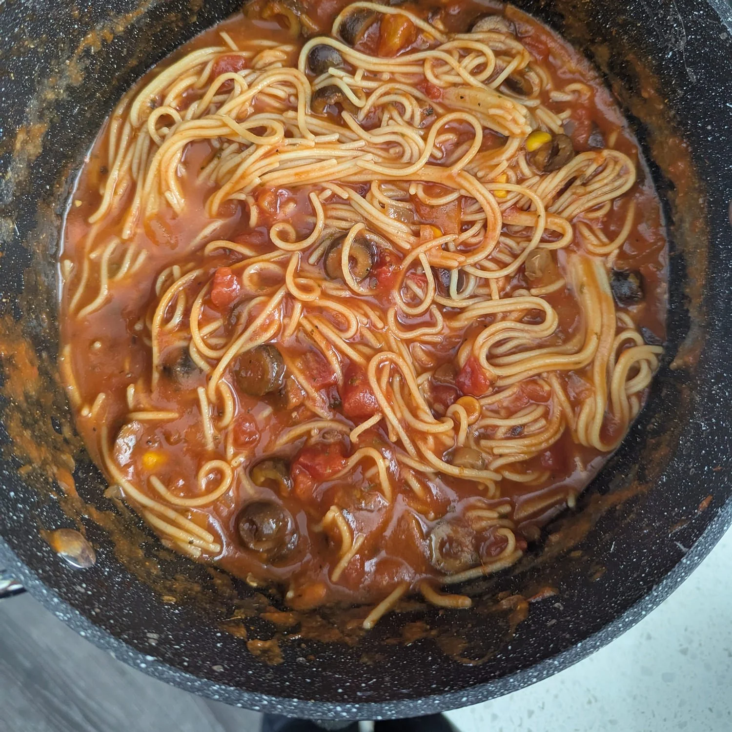 My partner loves to add other items to this spaghetti. Leftover corn? He tosses it in (hence the corn kernels in the photo above).